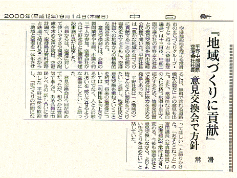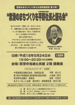 1月28日 1月度全体会 中央公民館 学習室2 勉強会「中部国際空港の現状と常滑市のまちづくり」 講師 常滑市企画部次長兼空港対策室長 渡辺郁夫氏 2月 9日 2月度全体会 鬼崎公民館 講義室 協議「平成12年度 あすとこねっとの活動について」 3月17日 3月度全体会 中央公民館 学習室2 講演会 講師 ネットワーク地球村 渡辺裕文氏 「私たちの地球は今・・」 〜宇宙線「地球号」からの特派員報告〜 5月 9日 平成12年度総会開催 6月19日 6月度全体会 会場「家紋 田中」 講師 中日新聞常滑通信局 小松田健一 氏 テーマ「そとから見た常滑の市民活動」 7月20日 7月度全体会 会場「中央公民館3階和室」 元朝日新聞 半田通信局長 岡本武司 氏 テーマ「常滑の特性とまちづくり」 9月13日 8月・9月度全体会 会場「鬼崎公民館2階講義室」 中部国際空港株式会社 取締役社長 平野幸久 氏 「空港建設と地域との連携」 懇談会 会場「キッチン たきや」![]()